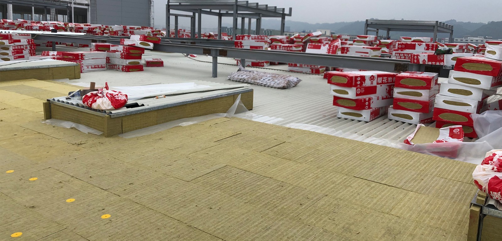 项目中岩棉的应用在于屋面保温系统,应用区域的特殊性,致使对岩棉要求不仅限于保温、防火等性能,而且岩棉板的抗压强度对屋面系统应用而言至关重要,需要在施工或后期维护时承载人员及设备的重量,以减少在施工过程中因塌陷而带来的运营损失。普通的屋面岩棉无法承受人体的重量,在施工时会造成产品塌陷,长期使用会产生积水现象,从而导致屋面漏水,带来不必要后期维护成本的增加。因此樱花高强度屋面岩棉板在研发时就针对这一问题进行研究,在抗压强度和点载荷都进行了优化提升,以满足施工时和后续维护时的承载需求,减少运营成本。